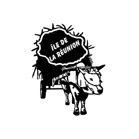 Sticker traditionnel représentant une charrette à bœuf chargée de cannes à sucre, surmontée de la carte de l’Île de La Réunion avec l’inscription "Île de La Réunion".